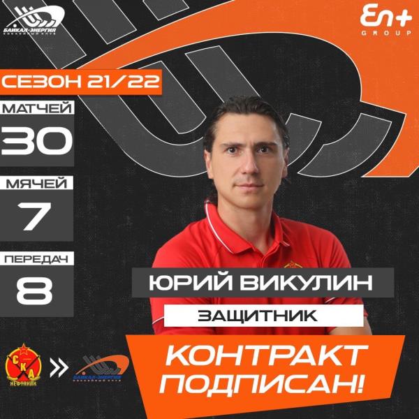 Уважаемые болельщики! Хоккейный клуб «Байкал-Энергия» и генеральный спонсор команды компания En+ Group объявляют о подписании контракта с защитником Юрием Викулиным