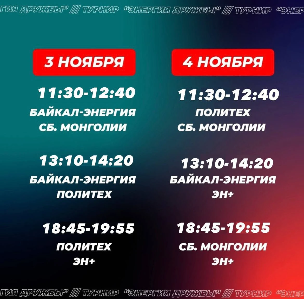 3-4 ноября мы приглашаем вас на захватывающее событие — турнир "Энергия Дружбы", в котором хоккей с мячом соединяет сердца двух народов! 🇷🇺🤝🇲🇳